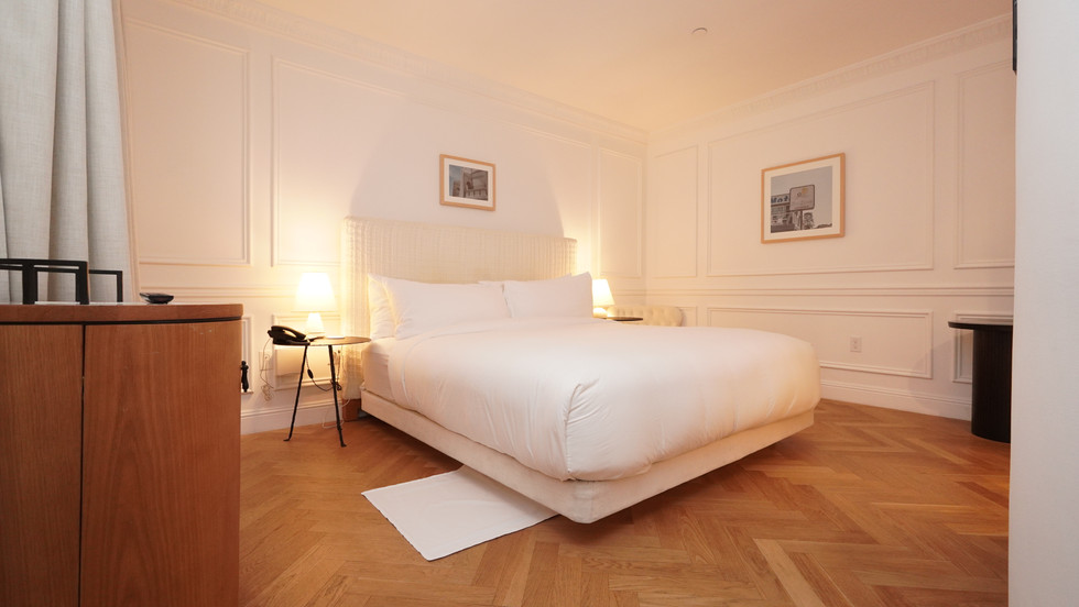 Cara is a minimalist chic hotel that beautifully executes a Mediterranean beach aesthetic. During my latest stay, I asked a member of staff if Mediterranean was the goal, and she wasn't sure but said it sounded right - so we're going to go with it. You enter the Cara via a stone staircase flanked by tall, luscious hedges. They cut out the surrounding streets and are the first taste of what Cara does really well - treat you to a Mediterranean getaway in the middle of LA. You enter the lobby and are immediately drawn to a gorgeous courtyard shaded by olive trees, flanked by curtains flowing in the breeze, and surrounding a shallow pool reminiscent of Greece's turquoise waters. It's beautiful, inviting, peaceful...perfect. This coastal vibe continues as you move through the guest walkways, and into the rooms themselves.
